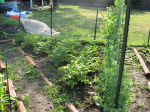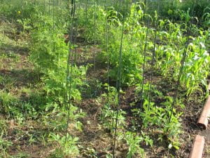 Tomatoes…more are flowering but I haven’t spied any fruit yet, plus some corn to the right: