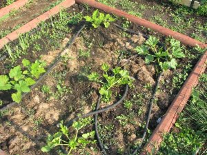 Zucchini on the right, summer squash in the middle and onions on the left edge.
