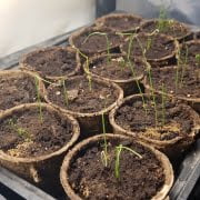 The tomatoes and cabbages are growing so well, they make me happy every time I look at them. Thanks to some kind folks in the Peace Country Gardener’s FB group, who steered me towards Solo cups to transplant these into this week. There are 4 to 5 plants in each of these little yogurt cups, they’ll be ready to really stretch soon.