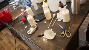 Anyway: lotion making. I had a new oil to try out – rice bran oil, which is suitable for very sensitive skin and a good moisturizer and protectant. I also dug out my small supply of Allantoin, a skin care superhero that has the ability to help slough off dead skin, enhance and promote self healing in damaged and irritated skin, and rebuilds new skin cell, and tinkered with the lotion formula and ended up with this. Oh wait, that’s just the mess from pouring it into bottles. Someday if I ever make any money with the lotions, I’ll get a filling machine.