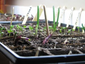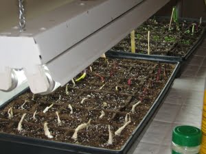 The onions are perking up quite nicely. I planted most of the rest of them in the far tray today, here you can see the ones I planted on the 18th with the cabbage just behind it –