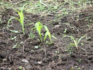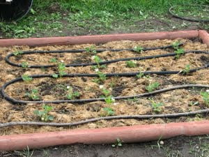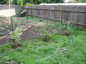 Potatoes. In front (bottom) are the 3 russets from organic store bought potatoes. The rest are reds from seed potatoes. I need to build the dirt up on each plant…with no experience I’m not exactly sure of the process, but apparently if you cover with dirt and leave just a couple inches of leaves out, the taters will grow better. Since they have clay soil to fight with after about 6 inches down, I might as well try anything that will safely give a better yield.