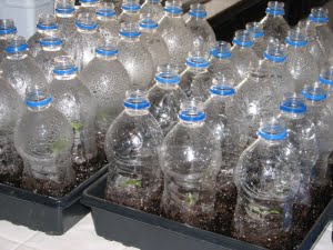 Water bottle, cut in half. 2 notches cut on the bottom edge for drainage. Fill bottom half with damp soil, add seed or plant. Water well. Cut slit on bottom edge of top piece so you can insert the top into the bottom. Ta-Da! Tacky but it works! And it’s getting one more use out of them before they go to the recyclers.